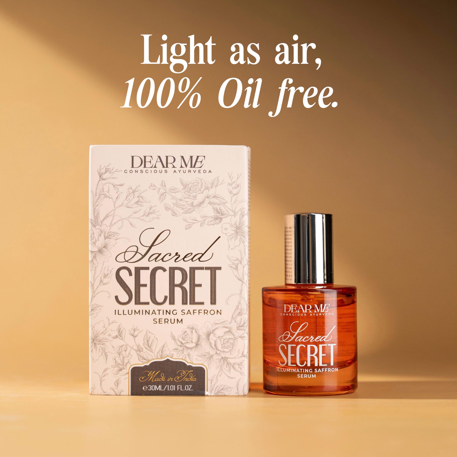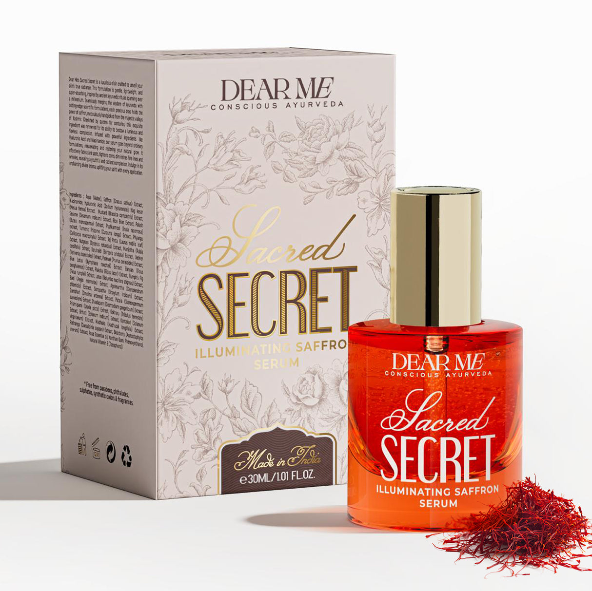 Dear Me's Sacred Secret, an antioxidant powerhouse, an opulent elixir unveiling your skin's true radiance. Inspired by ancient Ayurvedic wisdom and the sacred kumkumadi tailam, this luxurious serum seamlessly merges tradition with modern science. Enriched with handpicked Kashmiri saffron, cherished by queens for luminosity, and potent ingredients like Hyaluronic Acid and Niacinamide, it transcends ordinary formulations. From fading dark spots to tightening pores, each drop rejuvenates, revealing a youthful glow. Let its divine aroma, reminiscent of Kashmir's saffron fields, elevate your spirit with every indulgent application.