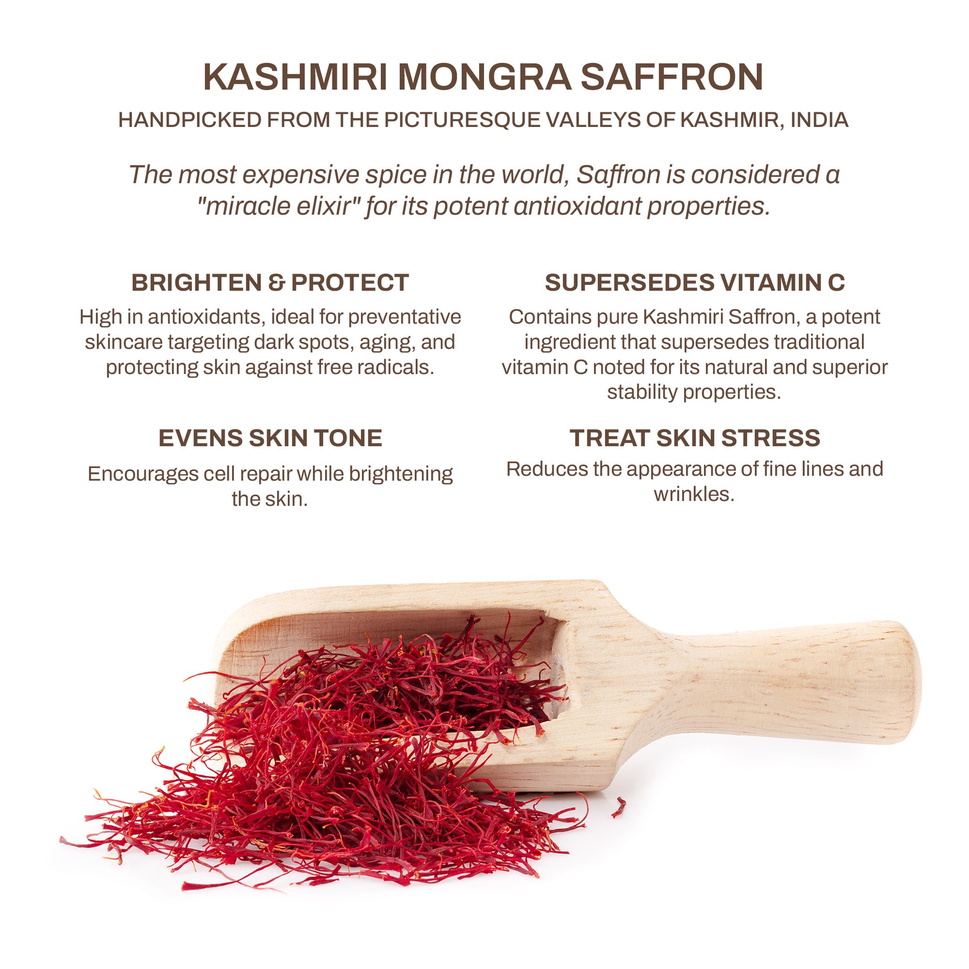 Handpicked from Kashmir's picturesque valleys of Pampore Region, Mongra saffron offers unparalleled radiance and skin benefits. This luxurious ingredient, harmoniously blended with modern science, ensures you experience the opulence of queens every day. Unlock your skin's luminous potential.