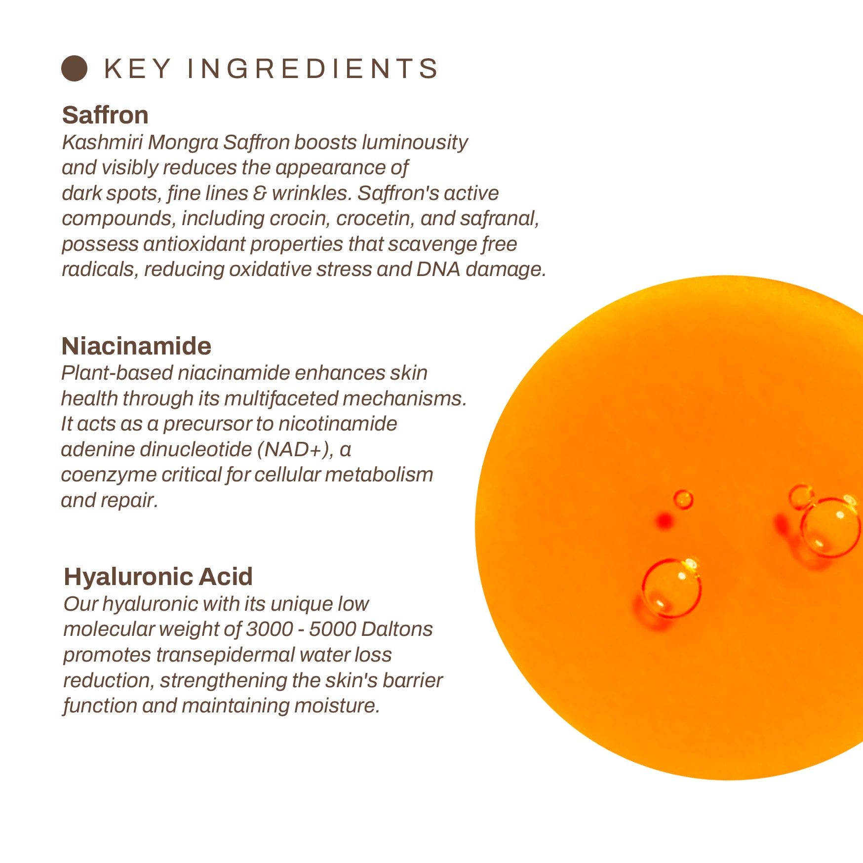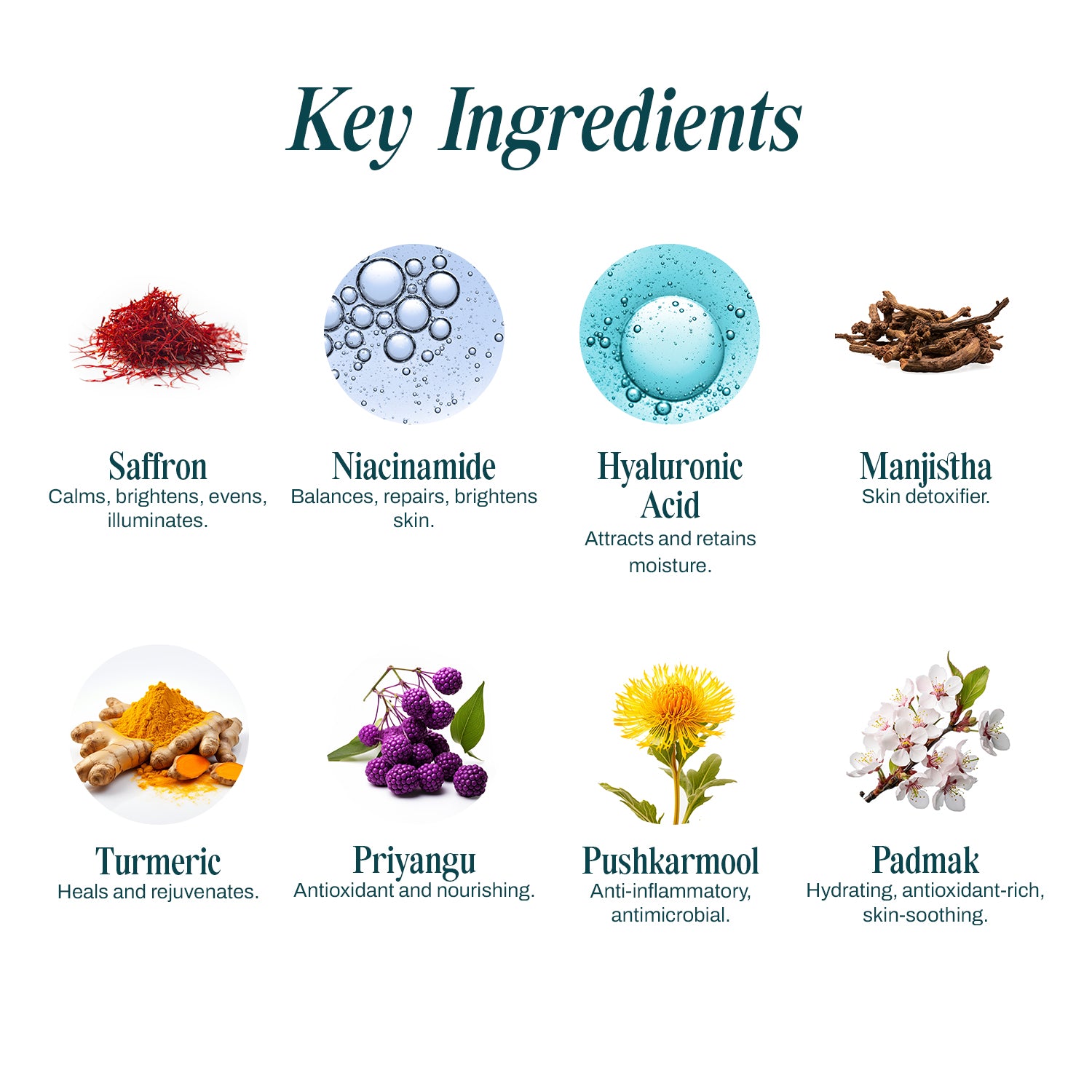 Aqua (Water), Saffron (Crocus sativus), Niacinamide, Hyaluronic Acid (Sodium hyaluronate), Nag kesar (Mesua ferrea), Mustard (Brassica campestris), Sesame (Sesamum indicum), Rice Bran, Palash (Butea monosperma), Pushkarmool (Inula racemosa), Turmeric Rhizome (Curcuma longa), Priyangu (Callicarpa macrophylla), Tej Patta (Laurus nobilis leaf), Nutgrass (Cyperus rotundus), Manjistha (Rubia cordifolia), Daruhaldi (Berberis aristata), Vetiver (Vetiveria zizanioides), Padmak (Prunus cerasoides), Blue Lotus (Nymphaea nouchali), Banyan (Ficus benghalensis), Plaksha (Ficus lacor), Rumph's Fig (Ficus rumphii), Lotus (Nelumbo nucifera stigmas), Bael (Aegle marmelos), Agnimantha (Clerodendrum phlomidis), Sonapatha (Oroxylum indicum), Gambhari (Gmelina arborea), Patala (Stereospermum suaveolens), Shaalaparni (Desmodium gangeticum), Prishniparni (Uraria picta), Gokharu (Tribulus terrestris), Brihati (Solanum indicum), Kantakari (Solanum virginianum), Madhuka (Madhucal longifolia), Pathanga (Caesalpinia sappan), Bearberry (Arctostaphylos uva-ursi), Rose Essential oil, Xanthan Gum, Phenoxyethanol, Natural Vitamin E (Tocopherol)