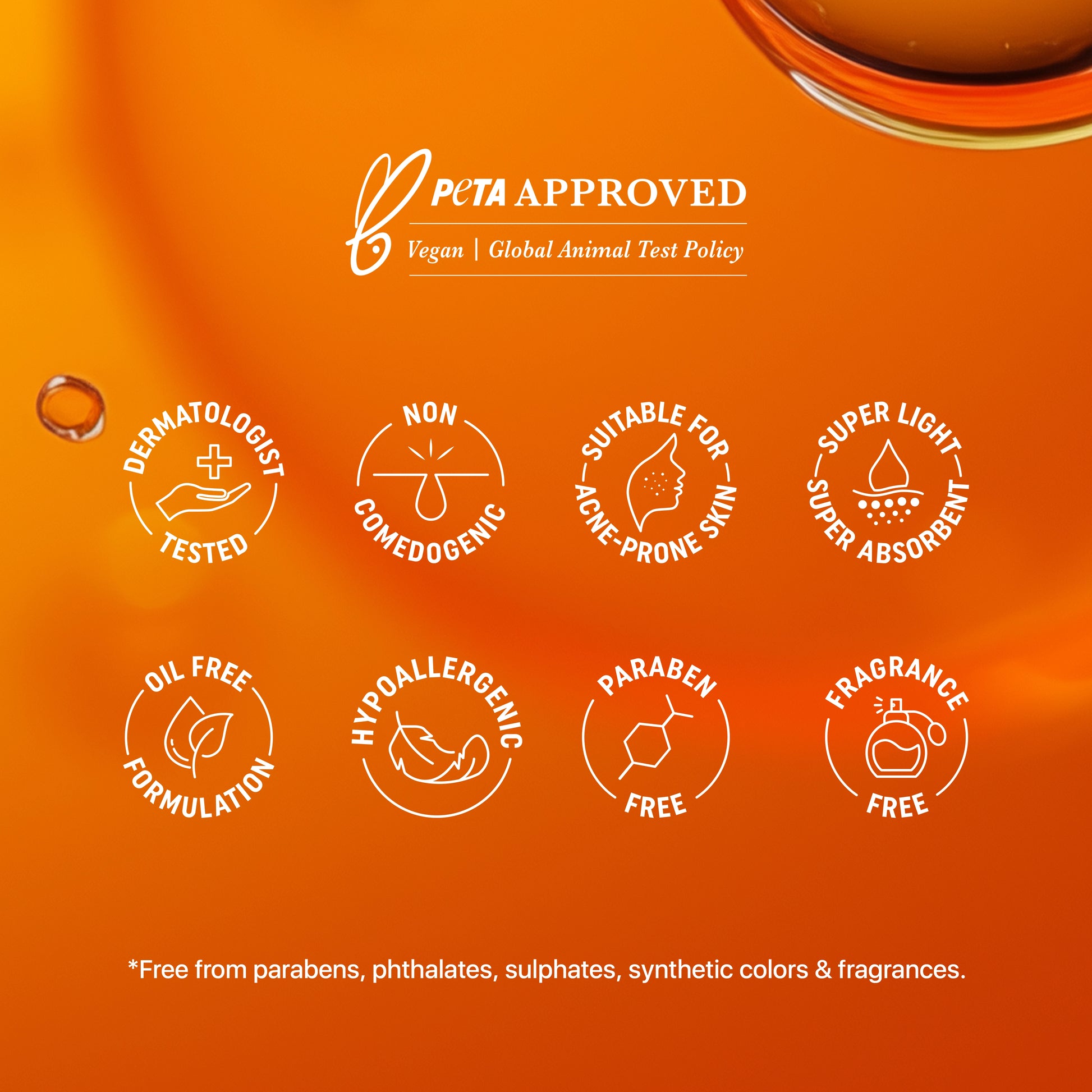 • Super Light & Super Absorbent • Oil-free Formulation • Dermatologist tested • Fragrance free • Allergy tested • Paraben free • Phthalate free • Alcohol-free • Non-Comedogenic • Cruelty Free • Vegan